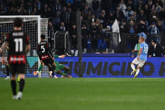 客戰(zhàn)拉齊奧,米蘭在邊路頹勢明顯。上輪的德比英雄埃斯圖皮尼安,在第23分鐘接到右側(cè)長傳,在遠(yuǎn)端搶在伊薩克森身前完成爭頂,制造了米蘭本場的第一次威脅,也給了紅黑擁躉一些幻覺。僅僅3分鐘后,他就在防守端犯下致命錯誤:馬魯希奇后場長傳找伊薩克森,本來并非極具威脅,可厄瓜多爾人錯判球路,在對抗中失去平衡,踉蹌中眼睜睜看著丹麥邊鋒持球殺入禁區(qū),單刀赴會擊敗邁尼昂。埃斯圖皮尼安與伊薩克森的對抗,并未隨著這粒失球結(jié)束,米蘭左翼衛(wèi)肉眼可見地落于下風(fēng)。慌亂的埃斯圖皮尼安,在下半場的頭球回傳還險些變成烏龍,逼迫邁尼昂做出了一次真正的撲救。他最終帶著一張黃牌狼狽下場。
