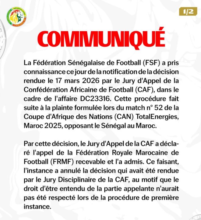 在被判0-3,摩洛哥之后,塞內(nèi)加爾足協(xié)官方發(fā)布公告回應(yīng),他們的態(tài)度也是非常強硬,將會在最短時間內(nèi)向位于洛桑的體育仲裁法庭(CAS)提起上訴。