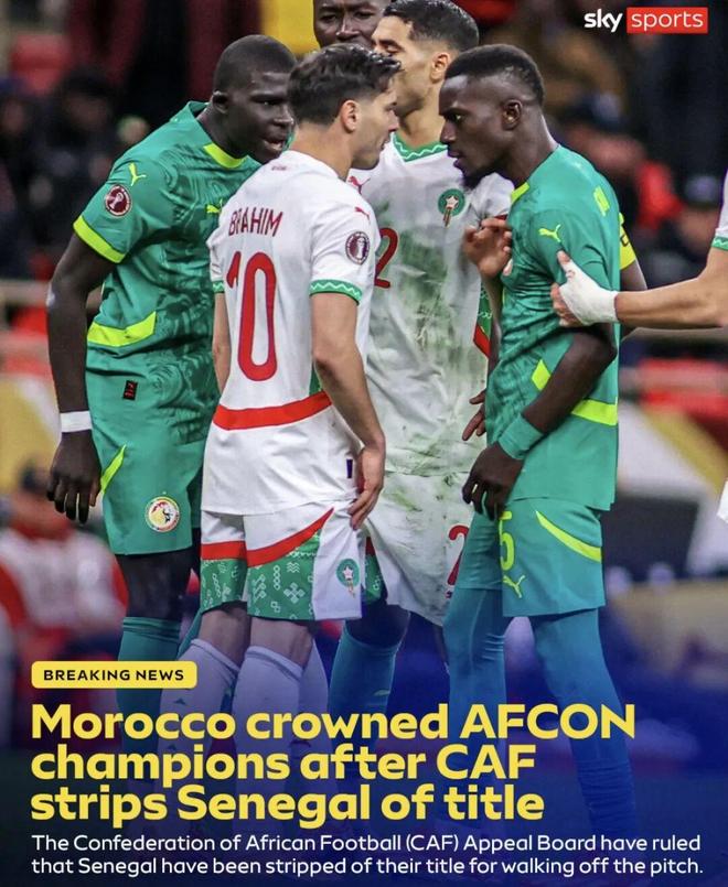 非洲足聯(lián)官方發(fā)布聲明,塞內(nèi)加爾國家隊被判在非洲杯決賽中棄權(quán),本場決賽按0-3摩洛哥獲勝。