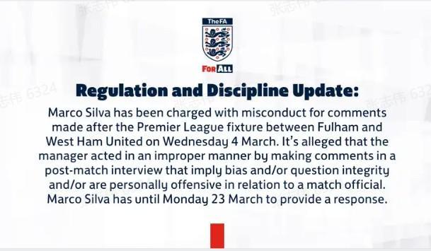 北京時間3月20日,英格蘭足球總會官方發(fā)表公告,富勒姆主教練馬爾科-席爾瓦因在對陣西漢姆聯(lián)的賽后對裁判發(fā)表不當言論被指控,需在3月23日前就相關(guān)指控作出回應(yīng)。