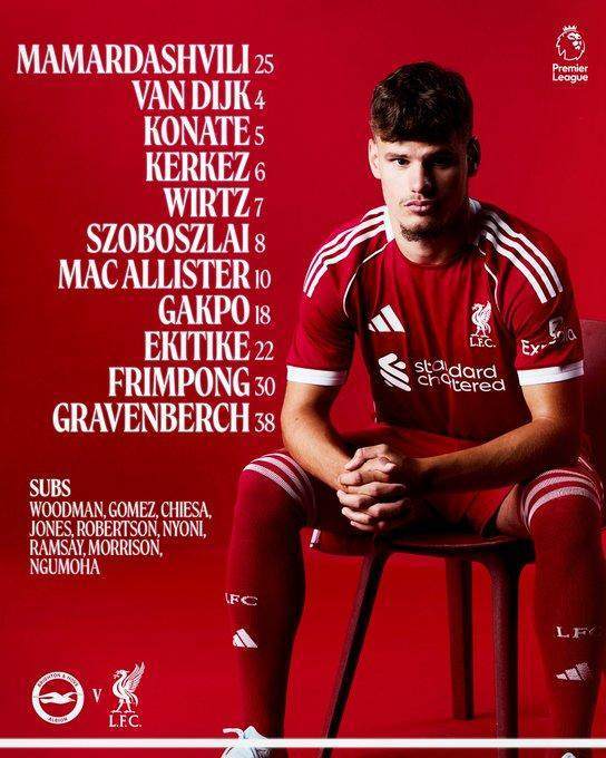利物浦陣容(4231):馬馬爾達什維利/弗林蓬、科納特、范戴克、凱爾凱茲/赫拉芬貝赫、麥卡利斯特/維爾茨、索博斯洛伊、哈克波/埃基蒂克