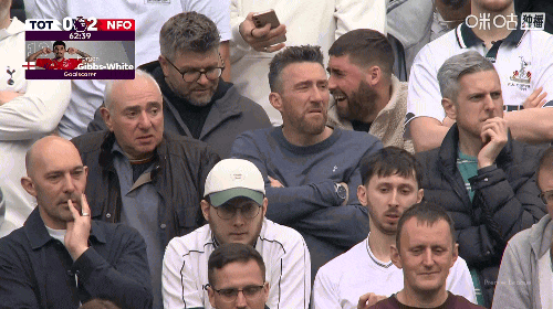 第62分鐘,0-2落后保級形勢嚴峻,現(xiàn)場熱刺球迷面無表情陷入無語