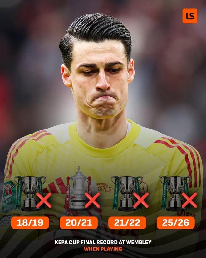 2026年英聯(lián)杯決賽,阿森納0-2不敵曼城,至此,阿森納門將凱帕在溫布利4次出戰(zhàn)杯賽決賽全部失利。
