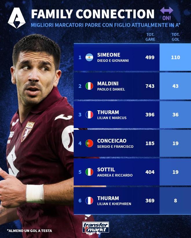 - 意甲歷史父子進(jìn)球榜:基耶薩父子第2,西蒙尼父子第5
