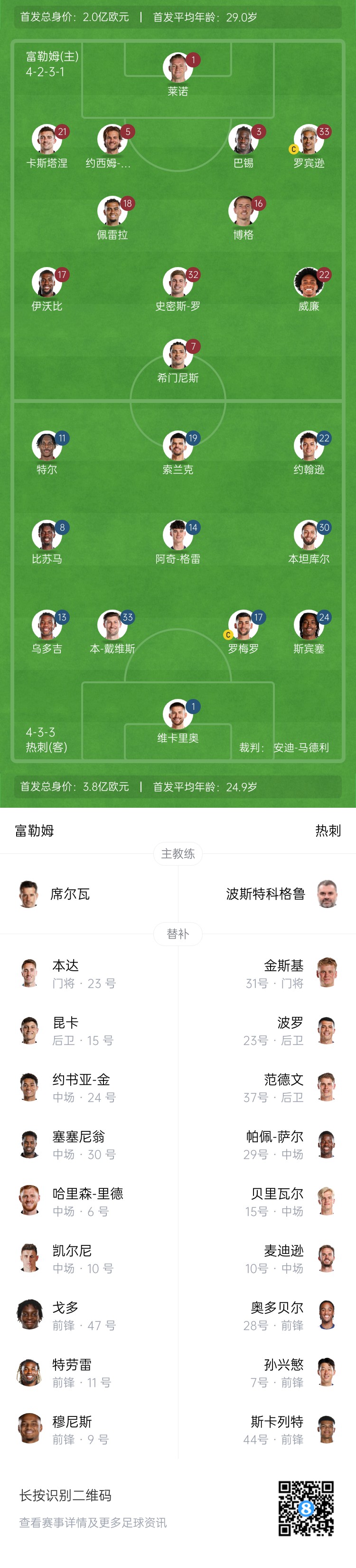 富勒姆首發(fā):1-萊諾、3-巴錫、5-安德森、21-卡斯塔涅、33-安東尼-羅賓遜、16-桑德-博格、18-佩雷拉、32-史密斯-羅、17-伊沃比、22-威廉、7-勞爾-希門(mén)尼斯