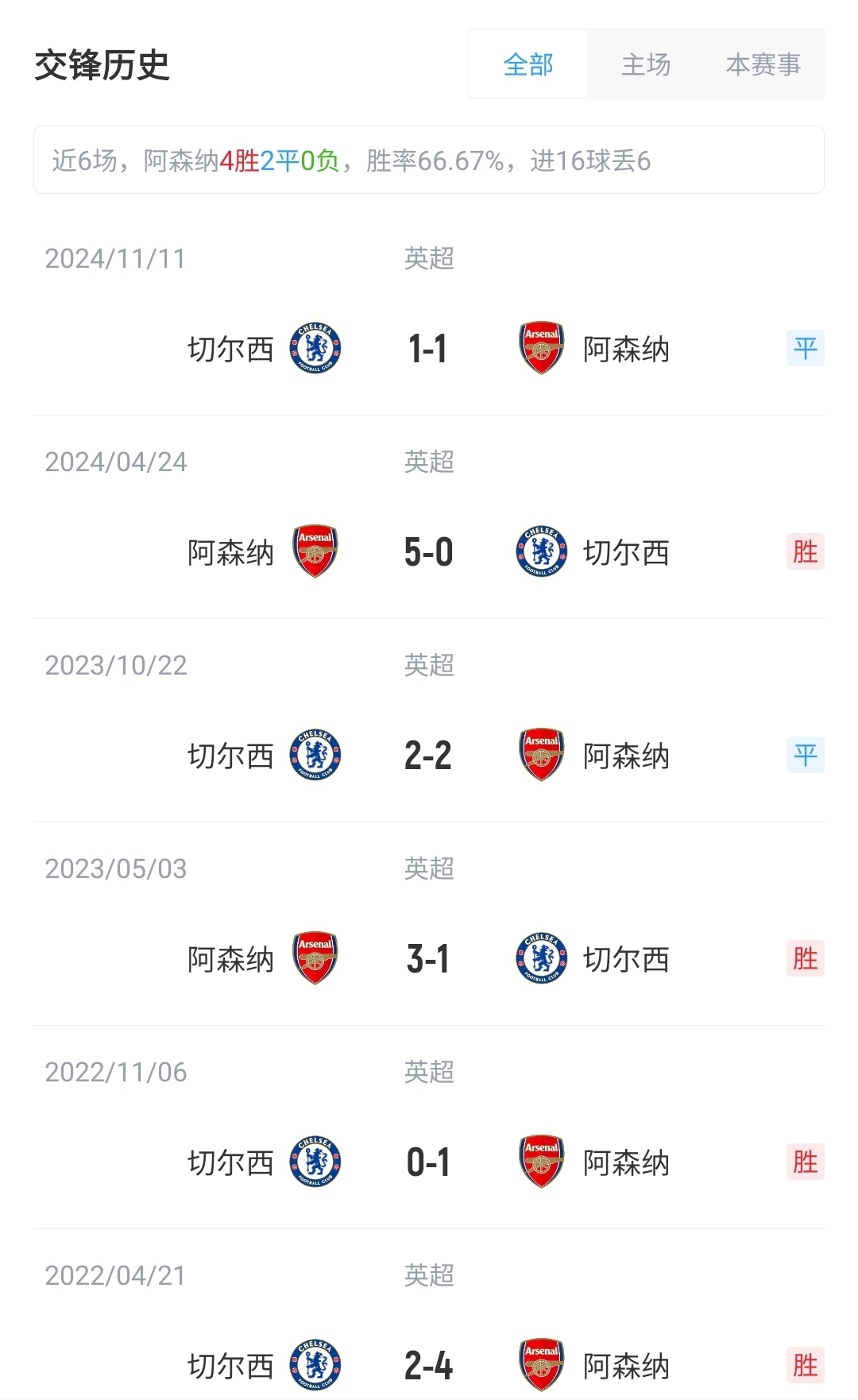目前英超積分榜上,阿森納15勝10平3負(fù)積55分,位列第2;切爾西14勝7平7負(fù)積49分,位列第4。近6次交手,阿森納4勝2平保持不敗。