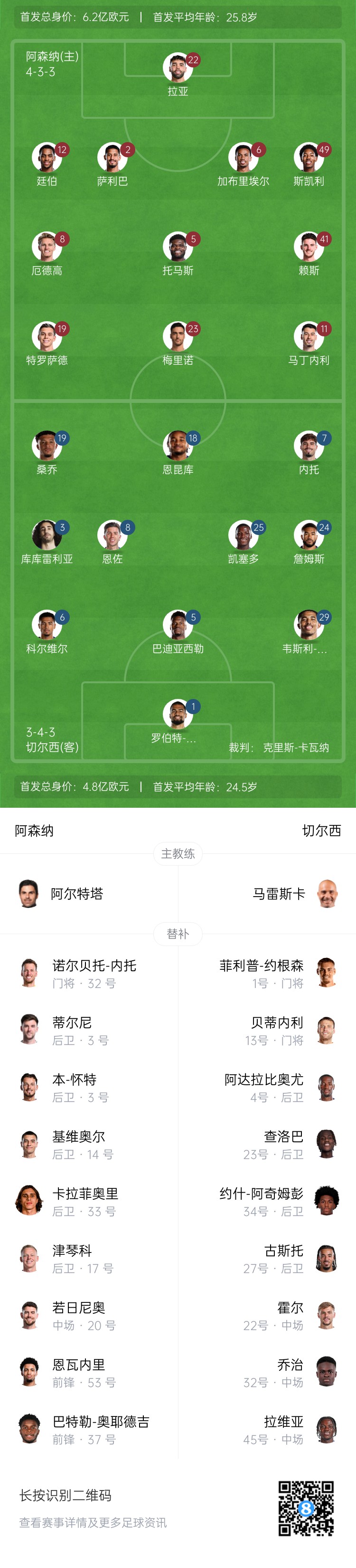 阿森納替補(bǔ):32-內(nèi)托、3-蒂爾尼、4-本-懷特、15-基維奧爾、17-津琴科、20-若日尼奧、33-卡拉菲奧里、37-奧耶德吉、53-恩瓦內(nèi)里