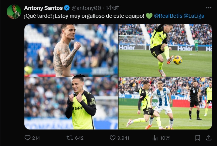 安東尼在社媒發(fā)文:“太棒了!我為球隊感到自豪?!?/p>