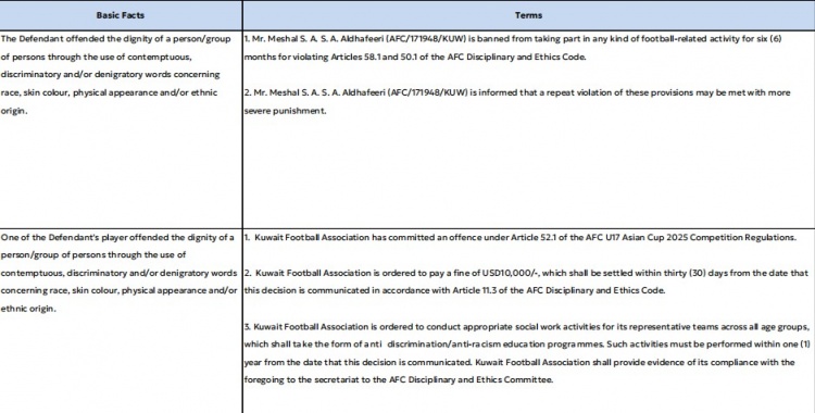 亞足聯(lián):科威特U17球員種族歧視行為被禁賽半年,足協(xié)罰款1萬美元
