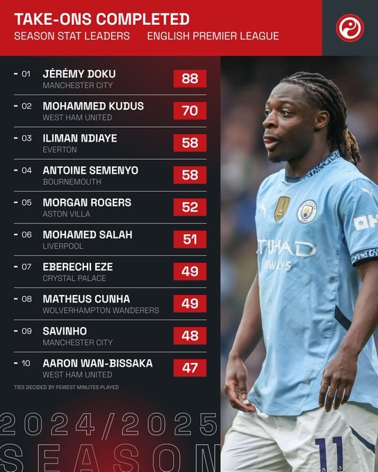 本賽季英超成功過人榜: