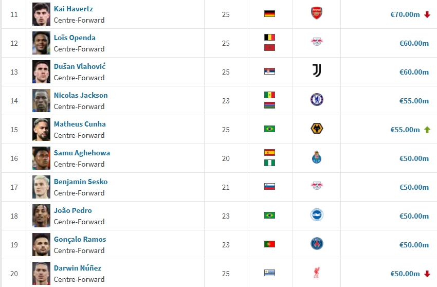 03月18日訊 德轉(zhuǎn)更新英超球員身價(jià)榜后,在最新的全球中鋒身價(jià)榜中,哈蘭德居首,姆巴佩次之,伊薩克升至第四。