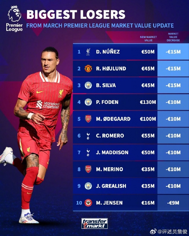 球員身價(jià)漲幅方面,伊薩克、恩瓦內(nèi)利以2500萬(wàn)歐的漲幅并列最多;跌幅方面,努涅斯、霍伊倫、B席均下跌1500萬(wàn)歐并列最多,槍手中場(chǎng)梅里諾下跌1000萬(wàn)歐,并列排第4位。
