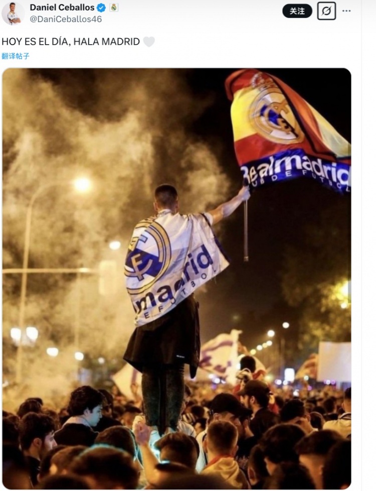 皇馬中場(chǎng)塞巴略斯更新社媒,曬出了一張身披皇馬隊(duì)旗的海報(bào),并配文寫(xiě)道:“就在今天,加油皇馬!”