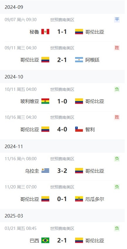 哥倫比亞在世預(yù)賽已經(jīng)遭遇3連敗,而在其美洲杯決賽不敵阿根廷之后,球隊(duì)在近7場(chǎng)比賽只取得2勝1平4負(fù)。具體戰(zhàn)績(jī)?nèi)缦拢?/p>