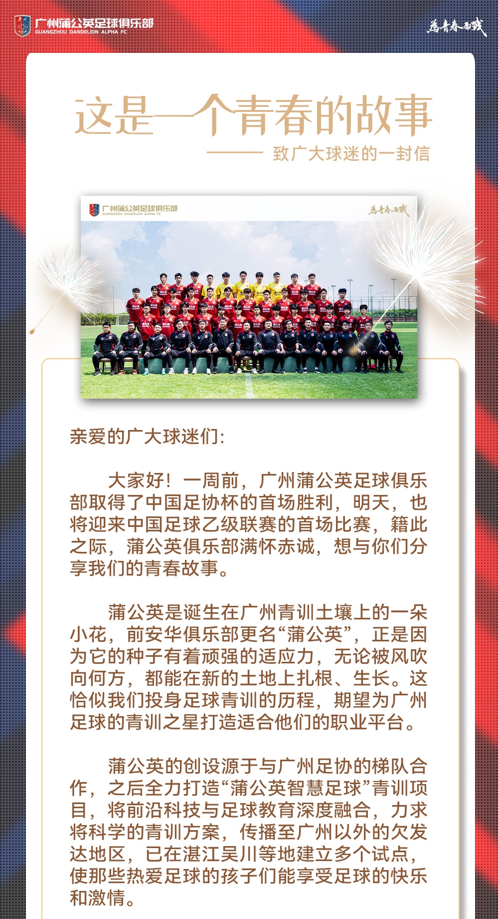 大家好!一周前,廣州蒲公英足球俱樂部取得了中國足協(xié)杯的首場勝利。明天,也將迎來中國足球乙級聯(lián)賽的首場比賽,籍此之際,蒲公英俱樂部滿懷赤誠,想與你們分享我們的青春故事。