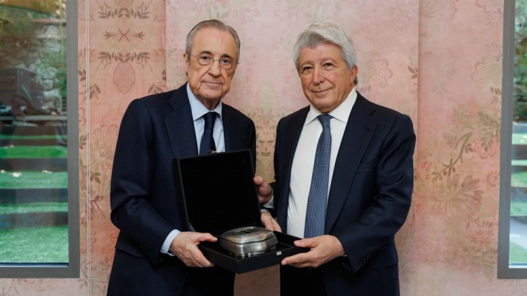 歐冠馬德里德比前,弗洛倫蒂諾與馬競(jìng)主席塞雷佐會(huì)面并贈(zèng)送禮物