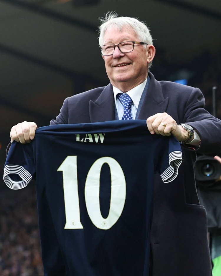 致敬傳奇,弗格森在蘇格蘭比賽前手舉丹尼斯-勞球衣