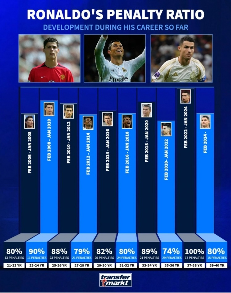 C羅職業(yè)生涯點(diǎn)球命中率:37到38歲100%最高,39到40歲80%