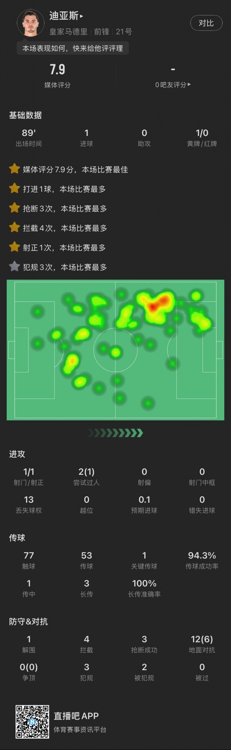 迪亞斯本場(chǎng)主要數(shù)據(jù)↓