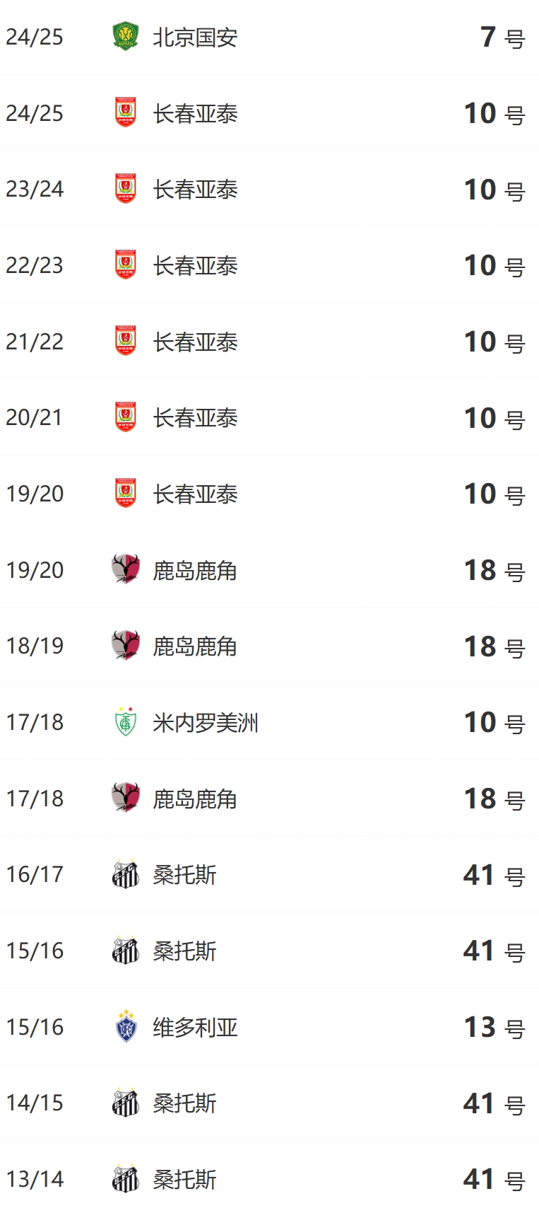 塞爾吉尼奧生涯號碼一覽: