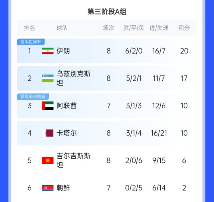 18強(qiáng)賽A組積分榜: