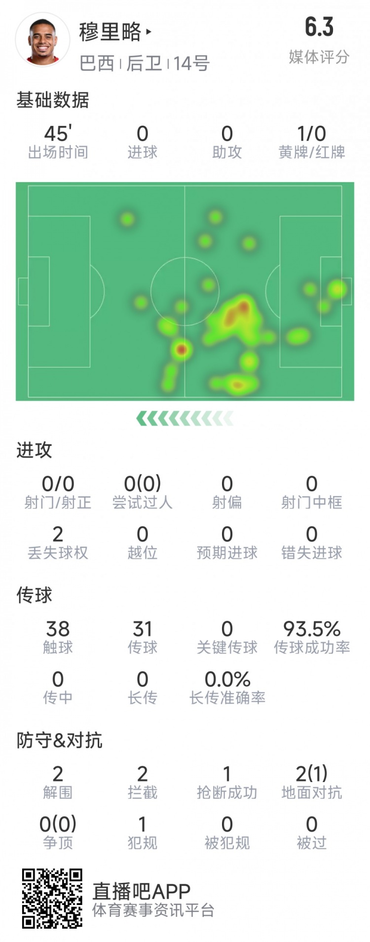 半場被換下,穆里略本場數(shù)據(jù):兩次烏龍助攻,2解圍&2攔截