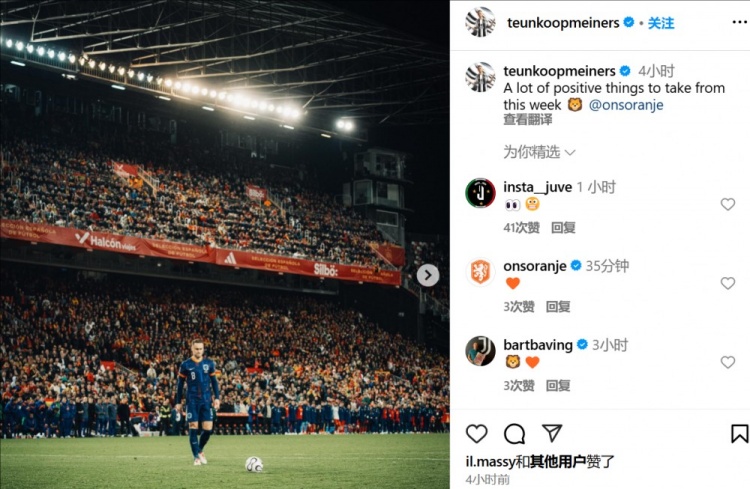 庫普梅納斯在社交媒體上寫道:“這一周發(fā)生了許多積極的事情?!闭б豢此坪跏菍δ陌抵S,但庫普梅納斯標(biāo)注了荷蘭隊,并且配圖也是荷蘭國家隊的賽場照,因此可以認(rèn)為他是在談?wù)摵商m的歐國聯(lián)之旅。