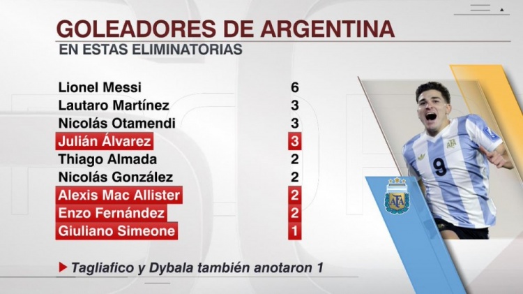 ESPN統(tǒng)計(jì)了阿根廷球員本屆世預(yù)賽的進(jìn)球數(shù)量,并列出榜單,梅西以6球居首,勞塔羅、奧塔門迪、阿爾瓦雷斯3球次席。