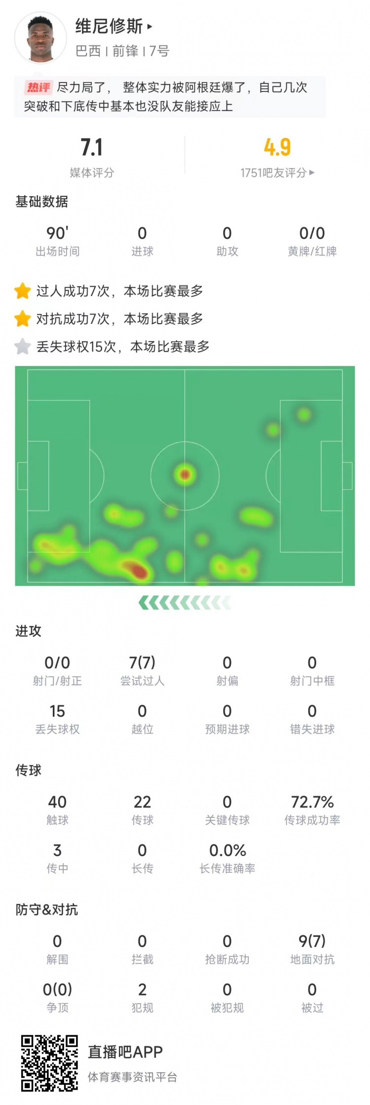 維尼修斯本場數(shù)據(jù):踢滿90分鐘0射門,7次成功過人全場最多