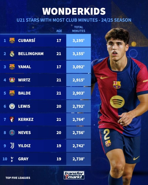 U21球員出場時(shí)間榜:17歲庫巴西3195分鐘居首,貝林厄姆2亞馬爾3
