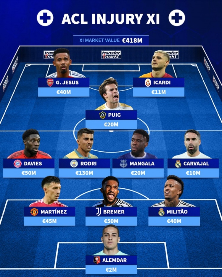 3月27日訊 德國轉(zhuǎn)會市場排出了本賽季十字韌帶受傷球員陣容,羅德里、戴維斯、米利唐、卡瓦哈爾、熱蘇斯、伊卡爾迪在列。