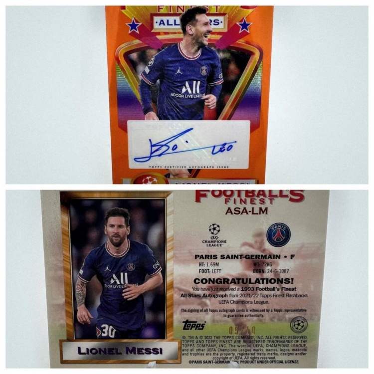 這張2021-22賽季Topps Finest Flashbacks UEFA Champions League Football’s Finest全明星簽名橙折射卡,全球僅印制10張。正面小字標注著“Topps認證簽名版本”。卡片背面還提供了更多保證:“所有Topps簽名卡的簽署過程均有Topps代表現(xiàn)場監(jiān)督,確保真實性?!边@張卡片潛在價值超過1000美元。