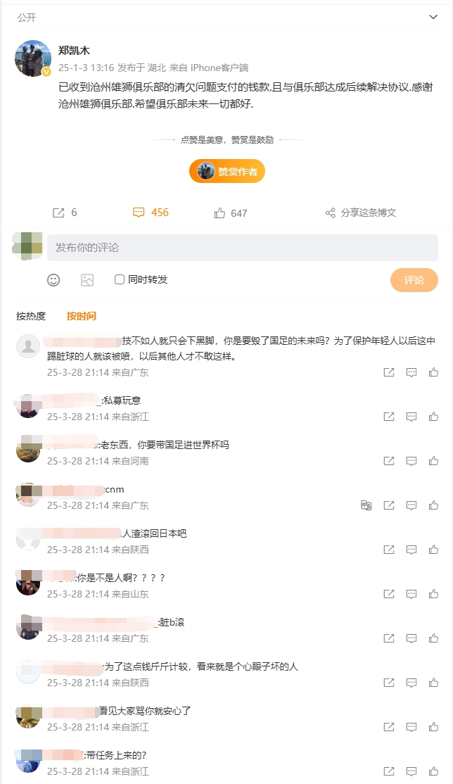 不少球迷第一時間沖入鄭凱木的個人微博進(jìn)行聲討,他最新的一條動態(tài)在短時間內(nèi)被刷了數(shù)百條評論,大多都是在責(zé)罵鄭凱木對王鈺棟的犯規(guī)。