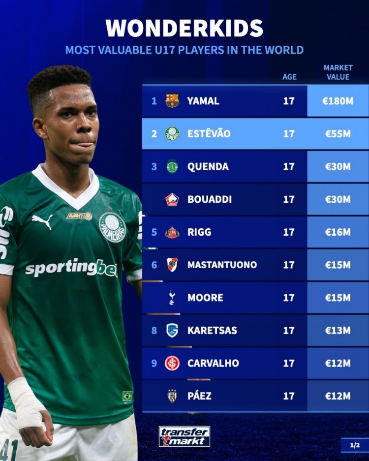 - 德轉(zhuǎn)U17身價(jià)榜:亞馬爾1.8億斷崖領(lǐng)跑,切爾西預(yù)訂埃斯特旺等多人