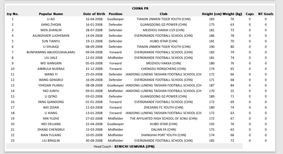 03月29日訊 亞足聯(lián)官方公布U17亞洲杯各隊(duì)23人名單,中國隊(duì)名單中艾比布拉領(lǐng)銜,魏祥鑫、布尼亞明在列。這支U17國足由上村健一掛帥,球隊(duì)近期共踢了4場(chǎng)熱身賽,均失利。