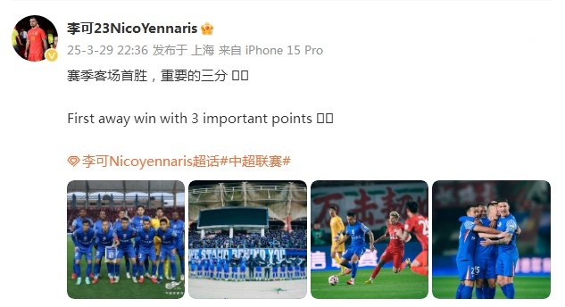 李可用中英文寫道:“賽季客場首勝,重要的三分!”