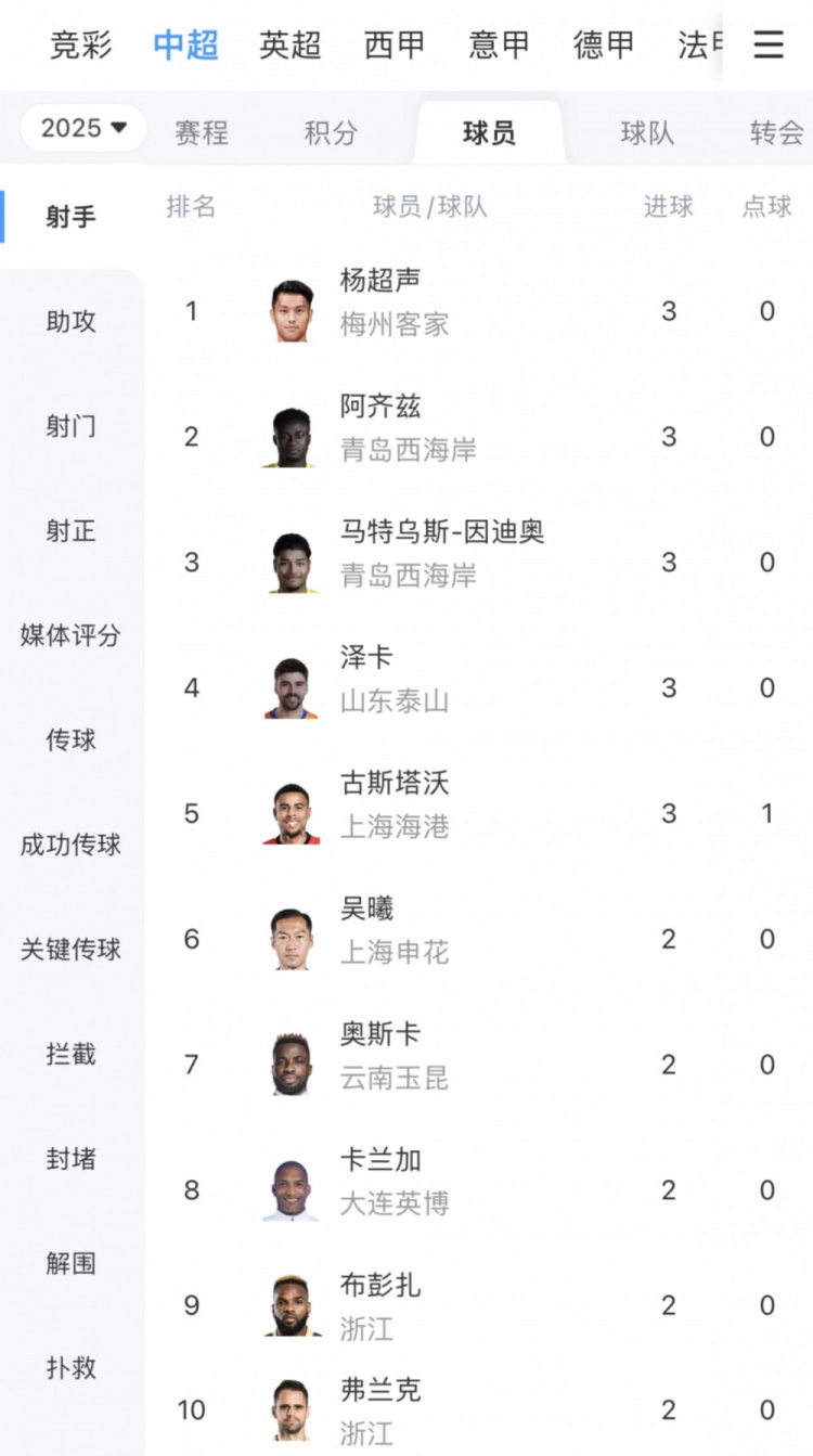 在射手榜上,打進(jìn)3球的球員并列排在榜首,其中本土球員僅有楊超聲一人,其他并列的球員還有阿齊茲、馬特烏斯、澤卡、古斯塔沃。