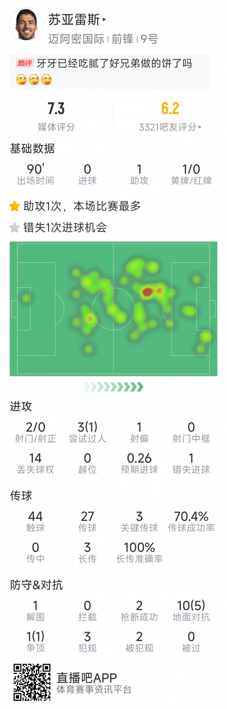 3月30日訊 在本輪美職聯(lián),邁阿密國際2-1擊敗費城聯(lián)合,本場比賽蘇亞雷斯為梅西送出助攻,以下為他在本場數(shù)據(jù):