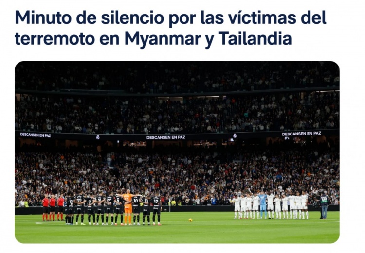 皇馬官網(wǎng)寫道:圣地亞哥-伯納烏球場在皇家馬德里與萊加內(nèi)斯的比賽開始前默哀一分鐘,悼念緬甸和泰國地震中的數(shù)千名遇難者。兩隊球員都佩戴了袖標。