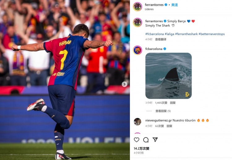 費蘭-托雷斯也在賽后通過社媒曬出自己的慶祝照,并配文:“依然巴薩!依然鯊魚!”自信而貪婪的鯊魚精神也是費蘭近年一直反復推崇強調(diào)的。