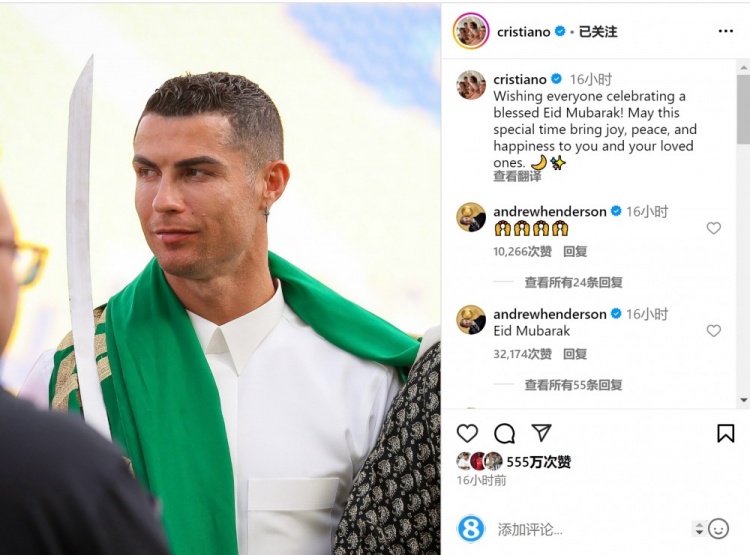- C羅社媒送開齋節(jié)祝福:愿這個日子給大家?guī)硐矏?、安寧與幸福