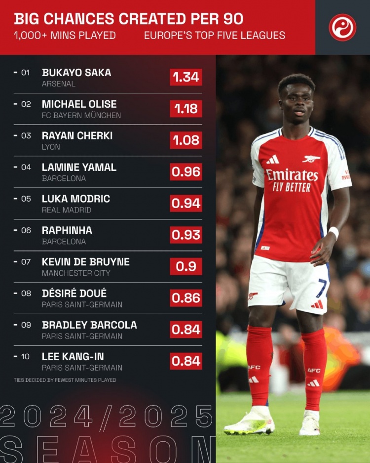 - 五大聯(lián)賽每90分鐘創(chuàng)造重大機(jī)會(huì)榜:薩卡1.34次居首,奧利塞次席