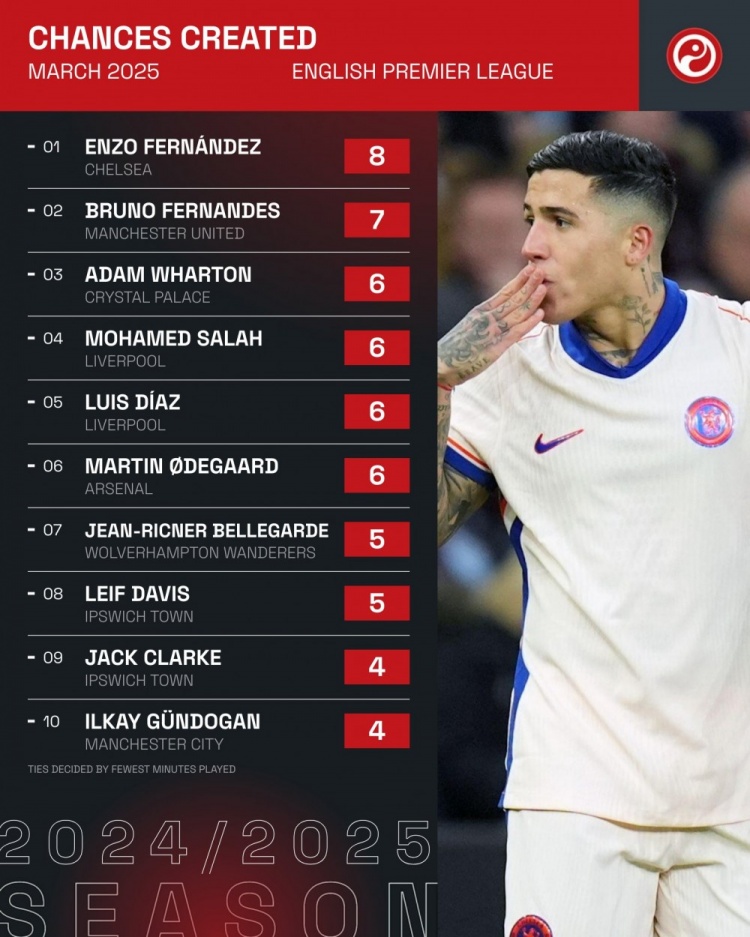 - 英超3月創(chuàng)造機(jī)會排名:恩佐8次居首,B費7次&薩拉赫6次