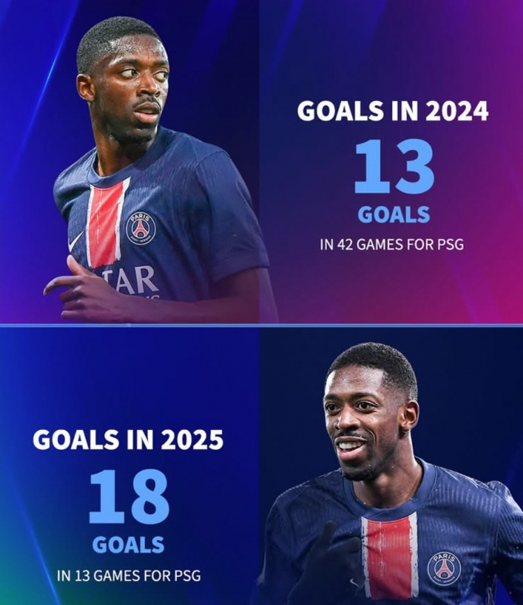數(shù)據(jù)統(tǒng)計顯示,登貝萊去年為巴黎各項賽事42場僅打進(jìn)13球,而今年13場已打進(jìn)18球。