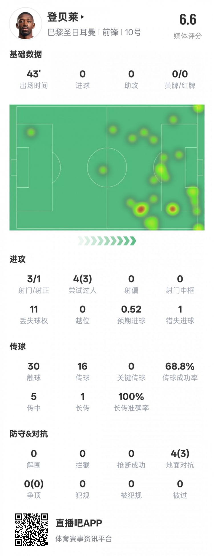 登貝萊半場數(shù)據(jù):3過人成功11次丟失球權(quán)&錯失1進球機會,評分6.6