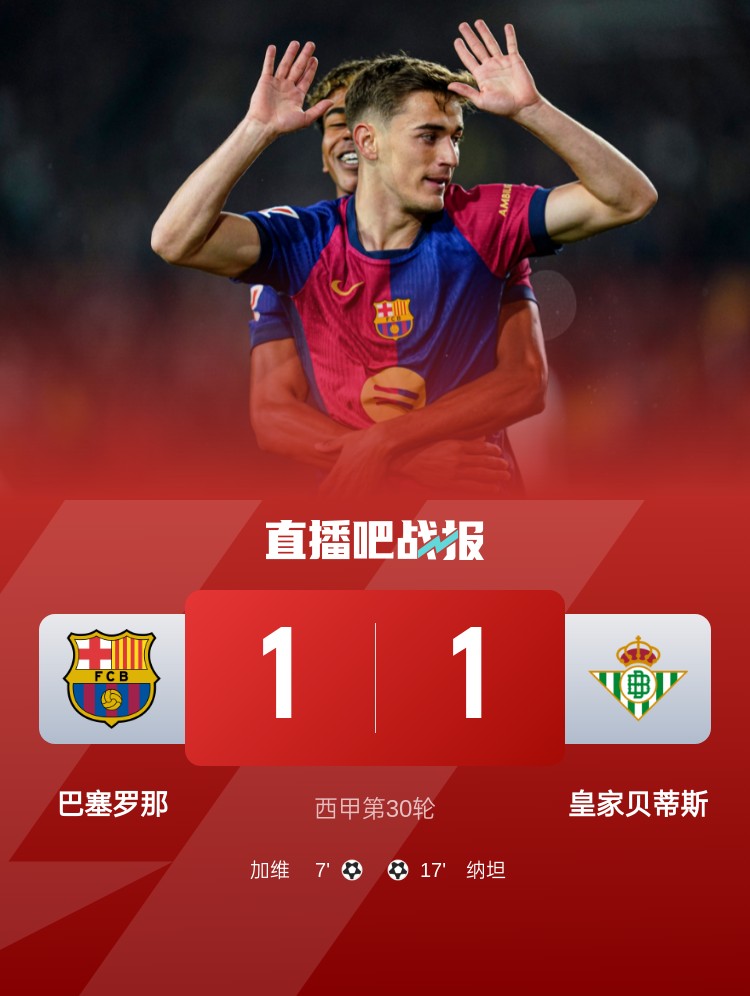 西甲第30輪,巴薩1-1貝蒂斯,聯(lián)賽九連勝終結(jié)。上半場,費蘭-托雷斯助攻加維破門,納坦扳平;下半場,兩隊均未改寫比分。