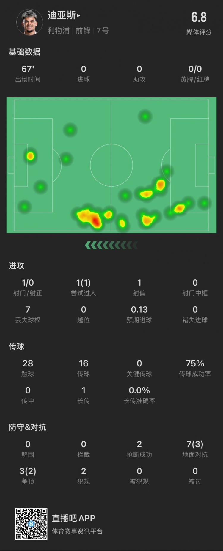 路易斯-迪亞斯本場(chǎng)主要數(shù)據(jù)↓