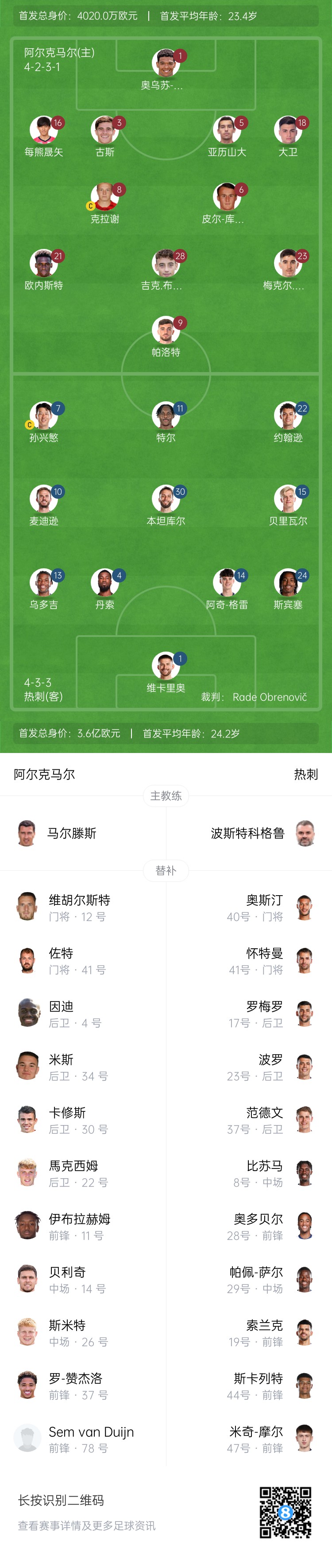 熱刺替補(bǔ):40-奧斯汀、41-懷特曼、8-比蘇馬、17-羅梅羅、19-索蘭克、23-波羅、28-奧多貝爾、29-佩普-薩爾、37-范德文、44-斯卡利特、47-摩爾