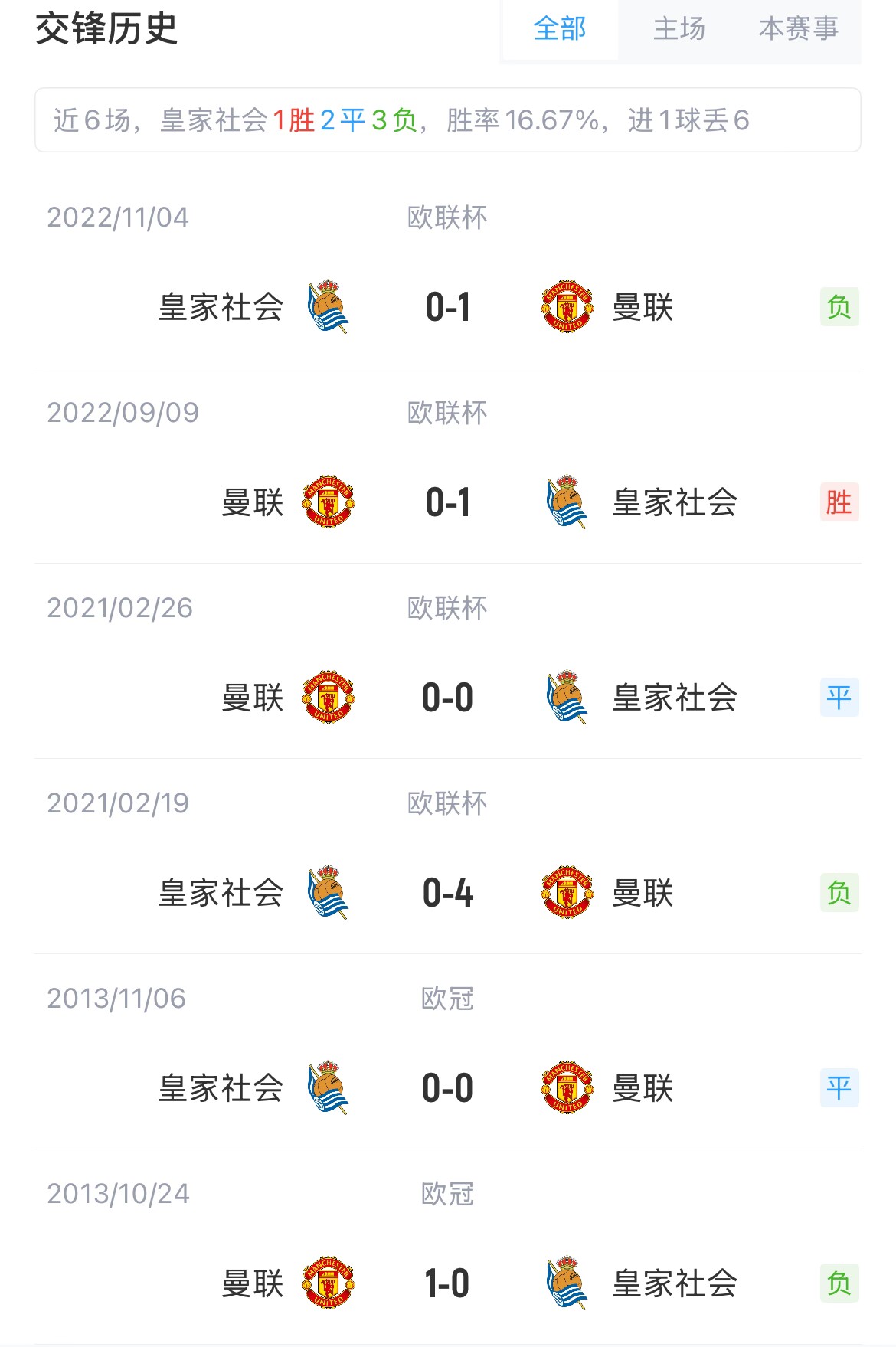 曼聯(lián)與皇家社會(huì)共交手過6次,曼聯(lián)3勝2平1負(fù)。此外,本賽季歐聯(lián)杯,曼聯(lián)目前是唯一一支不敗球隊(duì),他們聯(lián)賽階段5勝3平。