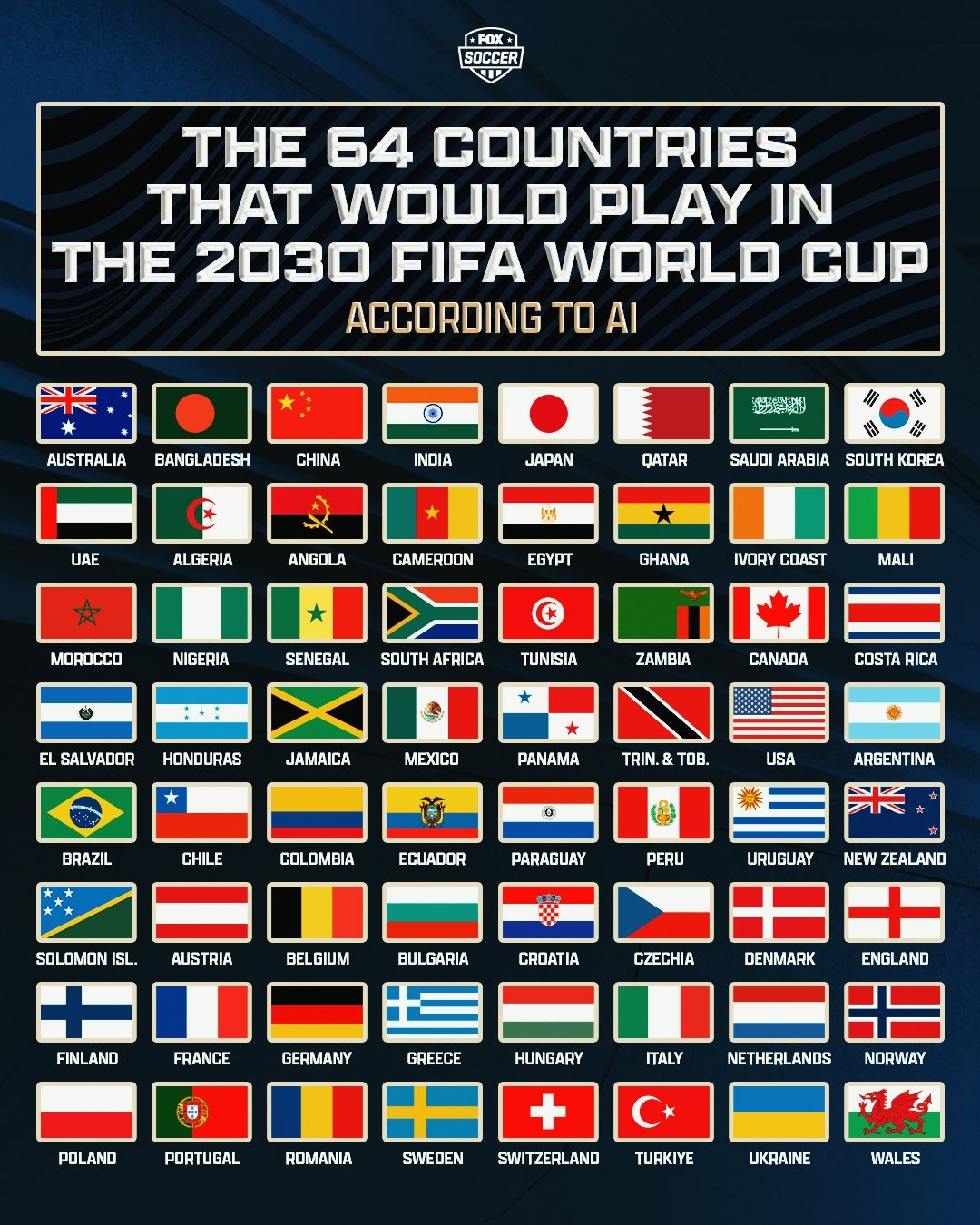 ??怂棺闱虬l(fā)文,表示要求ChatGPT列出如果2030世界杯擴(kuò)軍64支隊(duì)后所有的64個(gè)國(guó)家。同時(shí)??怂箤懙溃耗阌X得這種形式是個(gè)好主意嗎?